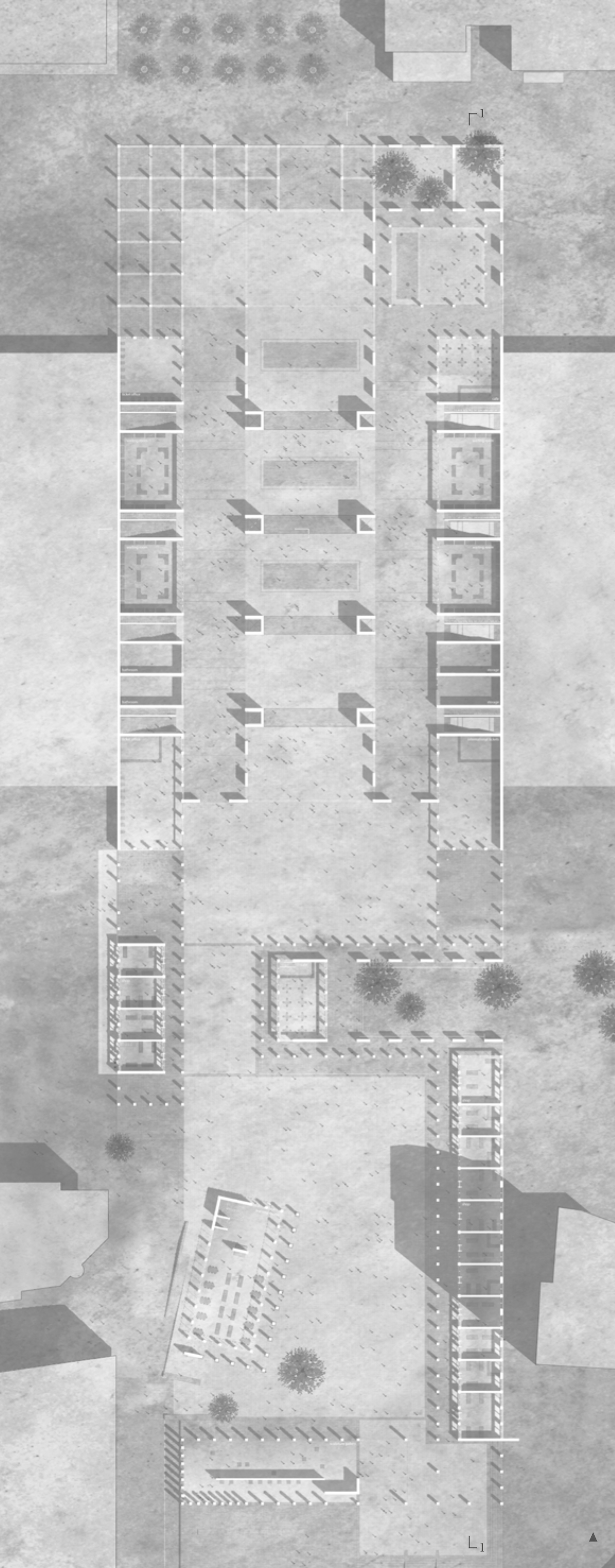 The goal of the project is to create a urban and human scale public space, which, on one hand, is connected to the surrounding fragmented spaces, on the other hand, creates its own quality and atmosphere. A space inspired to Palais-Royal in Paris, which is a part of the urban fabric, but at the same time seems isolated and introversive.